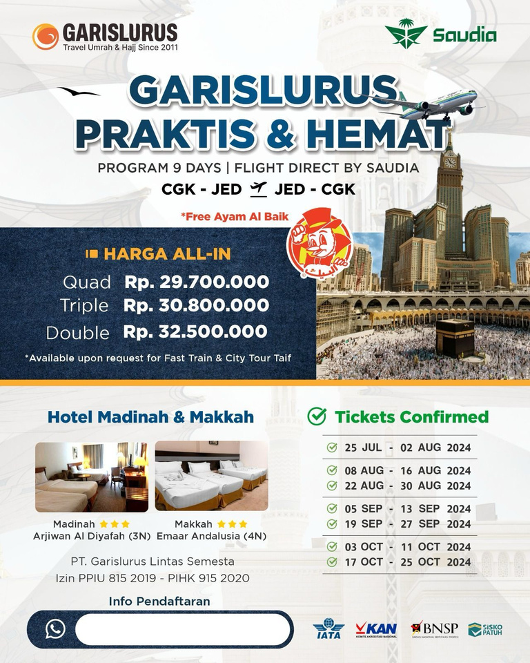 Garislurus Lintas Semesta juga terdaftar sebagai Wholesaler dari maskapai besar yaitu Saudi Arabian Airlines. Kami juga menjalin kerjasama dengan Wfood Al-Bait sebagai Syarikah yang berwenang mengurus operasional perjalanan ibadah umrah pada Kerajaan Saudi Arabia.