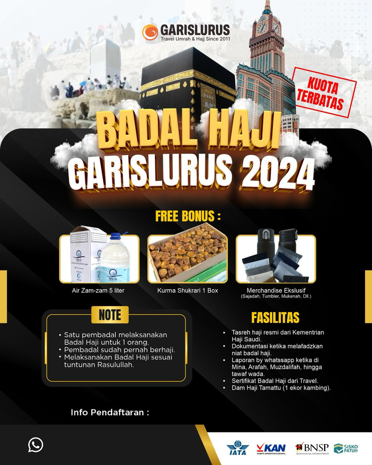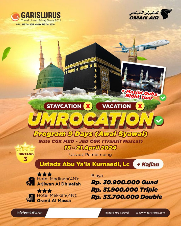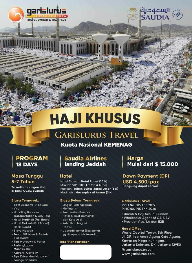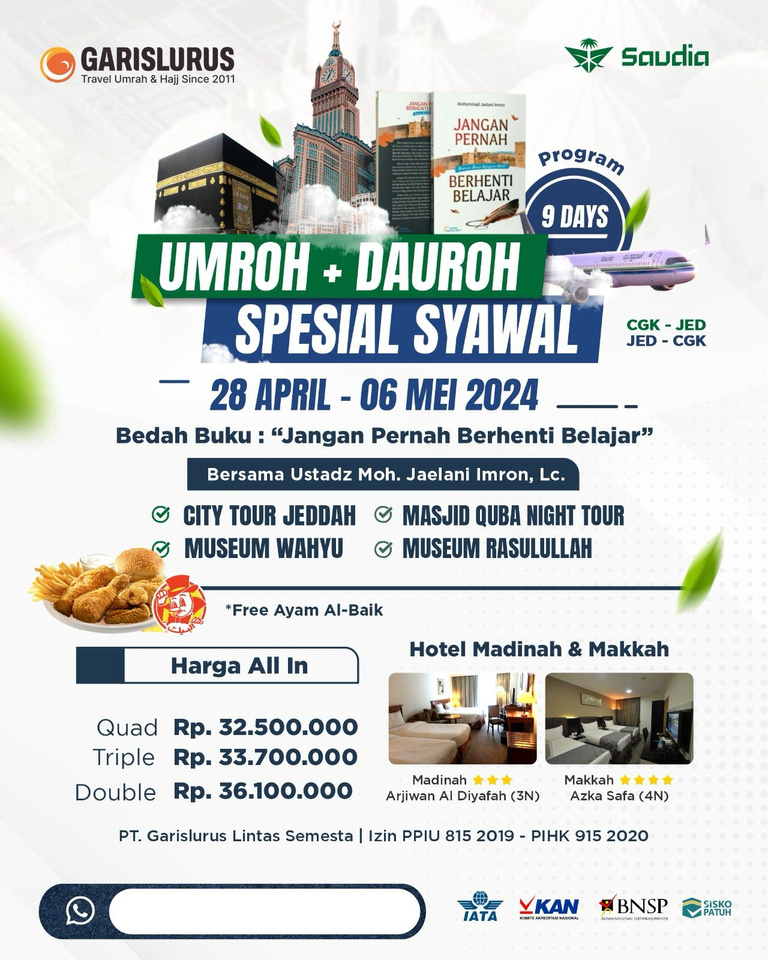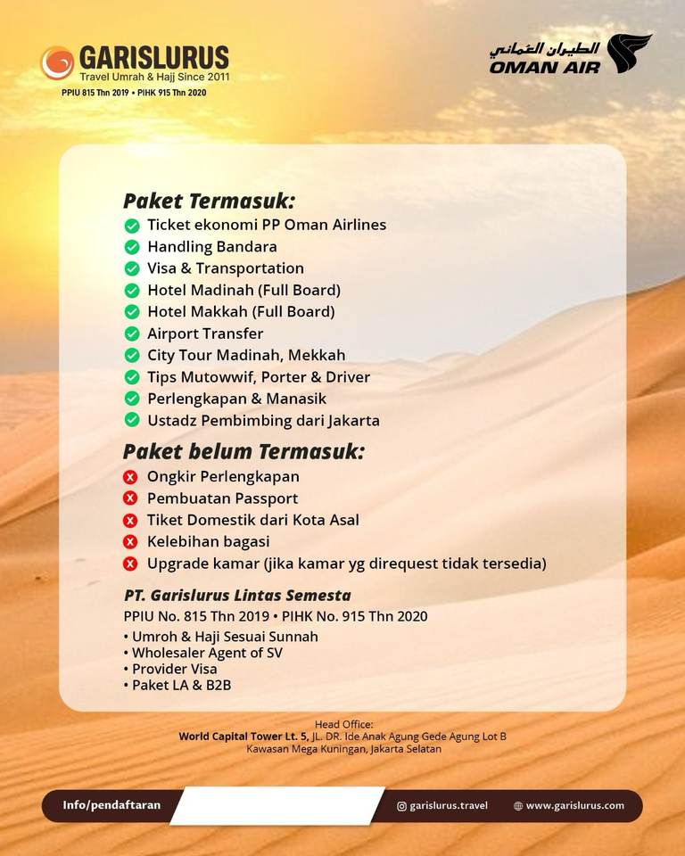 Garislurus Lintas Semesta merupakan penyelenggara ibadah umrah dengan izin resmi Penyelenggara Perjalanan Ibadah Umrah (Izin PPIU) SK Menteri Agama RI No. 815 Tahun 2019 dan Izin PIHK No. 915 Tahun 2020.